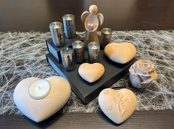 Es gibt mittlerweile eine Vielzahl an Anbietern für kleine Erinnerungsurnen aus Edelstahl oder Herzen und Engeln aus Holz, Schmuck in vielfältiger Art und Weise, die mit ein wenig Asche des Verstorben befüllt werden können.